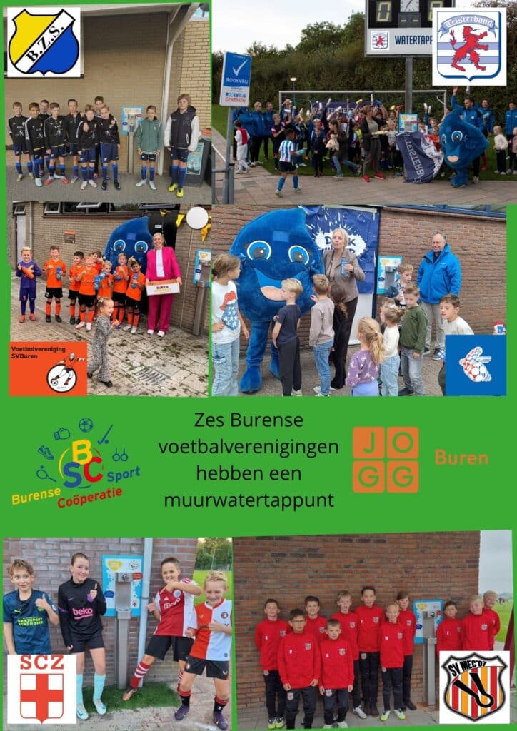 Tijdens de Nationale Sportweek is bij 6 Burense voetbalverenigingen een muurwatertappunt in gebruik genomen. Sv Buren, BZS Beusichem, FC Lienden, MEC’07, SCZ Zoelen en Teisterbanders Kerk-Avezaath bieden zo een duurzame en hygiënische oplossing aan de teams en toeschouwers en een gezond alternatief voor wegwerpflesjes. Water drinken is belangrijk voor de gezondheid en het past bij de gezonde doelstellingen die de clubs hebben. “Dit is een prachtig initiatief en past prima binnen de vitaliteits- en gezondheidsdoelstellingen van onze voetbalverenigingen. Hier is echt sprake van een win-win situatie”, aldus Joris Maier, voorzitter van de BSC en JOGG-regisseur binnen de gemeente Buren. De muurwatertappunten zijn mede mogelijk gemaakt door de gemeente Buren vanuit JOGG (Gezonde Jeugd, Gezonde Toekomst) in samenwerking met de Burense Sport Coöperatie (BSC). Als JOGG Gemeente zet de gemeente Buren zich in voor een gezonde leefomgeving voor de jeugd.
